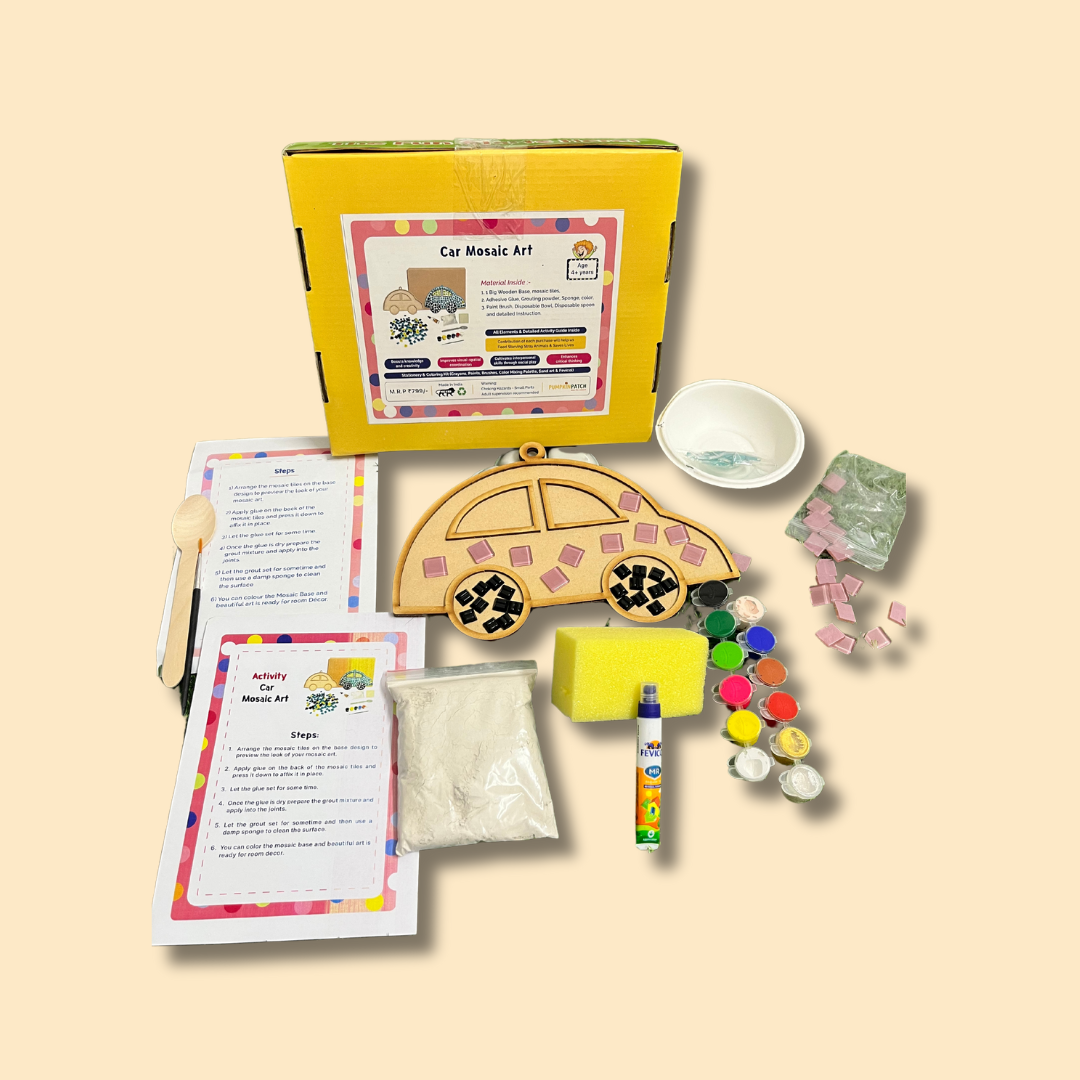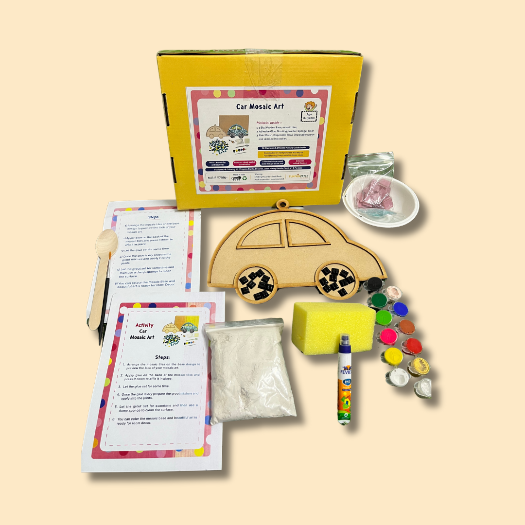 Rev up your child's creativity with our "Car Mosaic Art" kit, the perfect craft project for young car enthusiasts aged 5-12. This engaging kit comes packed with a large, premium quality wooden cutout in a dynamic car theme, ready to be adorned with a colorful array of mosaic tiles. With 12 vibrant shades of paint, Fevicol, a sponge, and an all-inclusive activity guide, this set offers a hands-on approach to art and creativity. Priced at just 699 and neatly presented in a 10" by 8" box, it's an ideal gift to inspire artistic talent and a love for vehicles. Gear up for hours of creative play and artistic expression!