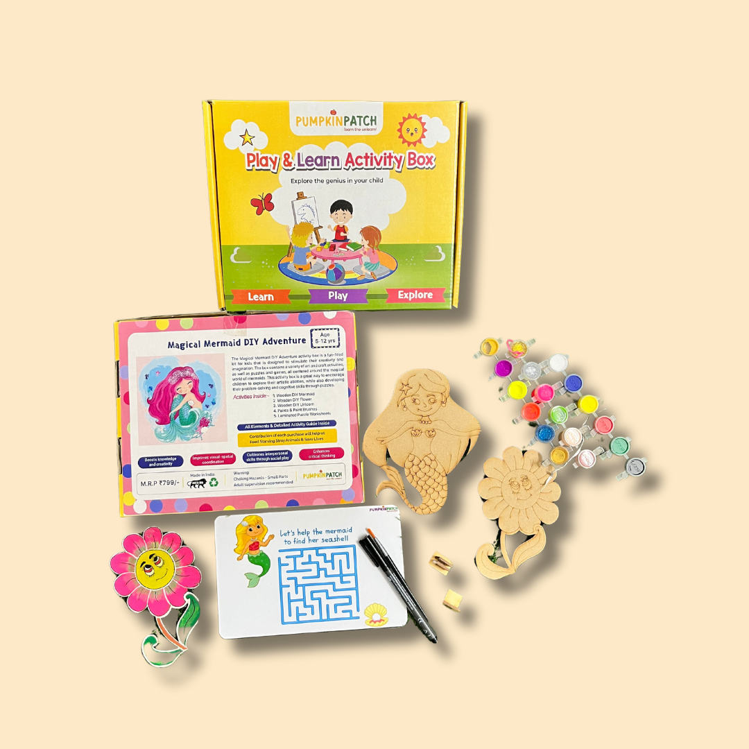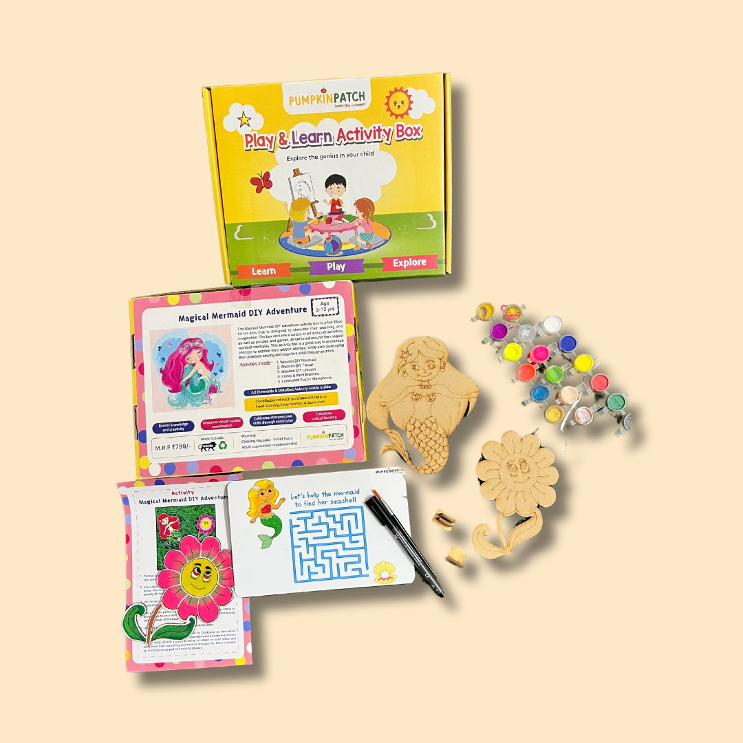 Dive into a world of creativity with the "Magical Mermaid Art" kit, designed for young artists aged 5-12 years. This enchanting set includes two premium quality wooden cutouts featuring mesmerizing mermaids and a cheerful sunflower, ready to be brought to life with 18 vibrant shades of paint. The kit also contains two stands for displaying your masterpieces, a black marker for fine detailing, and a laminated puzzle sheet for added fun. Accompanied by an easy-to-follow activity guide, this kit is the perfect blend of fun and education, priced at just 799. Unleash your child's artistic potential and decorate your home with their unique creations!