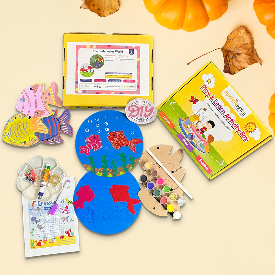 Immerse in an aquatic creative adventure with The Underwater World Craft Kit! Featuring three premium wooden cutouts of fishes, paints, brushes, an ocean puzzle, marker pen, Fevicol, and string, this set ignites imaginative exploration. Kids aged 5 and above can craft mesmerizing hanging fish displays with step-by-step instructions from the activity guide. Stimulate artistic expression, fine motor skills, and storytelling as children create vibrant underwater scenes. Encouraging hands-on creativity, this kit fosters a love for art while providing a delightful and educational crafting experience.