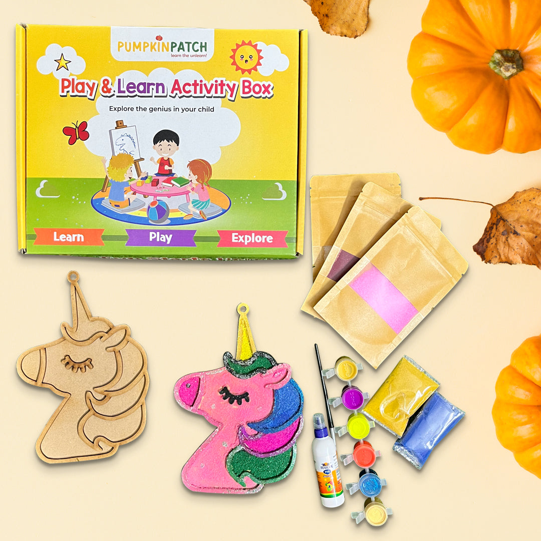 Experience enchanting creativity with the Wooden Unicorn Sand Art DIY! This captivating kit is tailored for individuals aged 8 and above, offering the opportunity to craft dazzling wooden unicorn hangings using sand art. With six mesmerizing shades of colorful sand, Fevicol, paints, and brushes, this activity ignites imaginative expression. Children can intricately design wooden unicorn hangings, fostering a passion for arts and crafts. Encourage fine motor skills and unlock imaginative flair as they layer a spectrum of sand colors, creating visually stunning textures. Perfect for imaginative play and artistic endeavors, this activity adds a touch of magic to spaces with unique sand art creations!